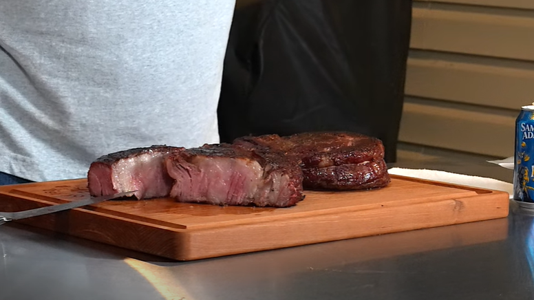 Alright, let's get them on the cutting board. As always, cheers! Here we are into the cook. Two giant bone-in ribeyes. Like I said, bought a three-bone ribeye, cut into three nice steaks, tied them up myself... I wanted to see how it was going to play out, but seemed to work pretty nice... You know what happens. You'll see it when we cut into it.