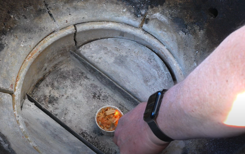 The other thing is this is the first time we're using the fire starters in the Kamado Joe, and I always like put the starter on the ashtray and then light from the bottom and put the coals on top.