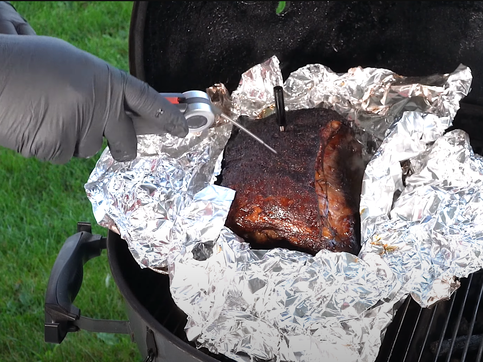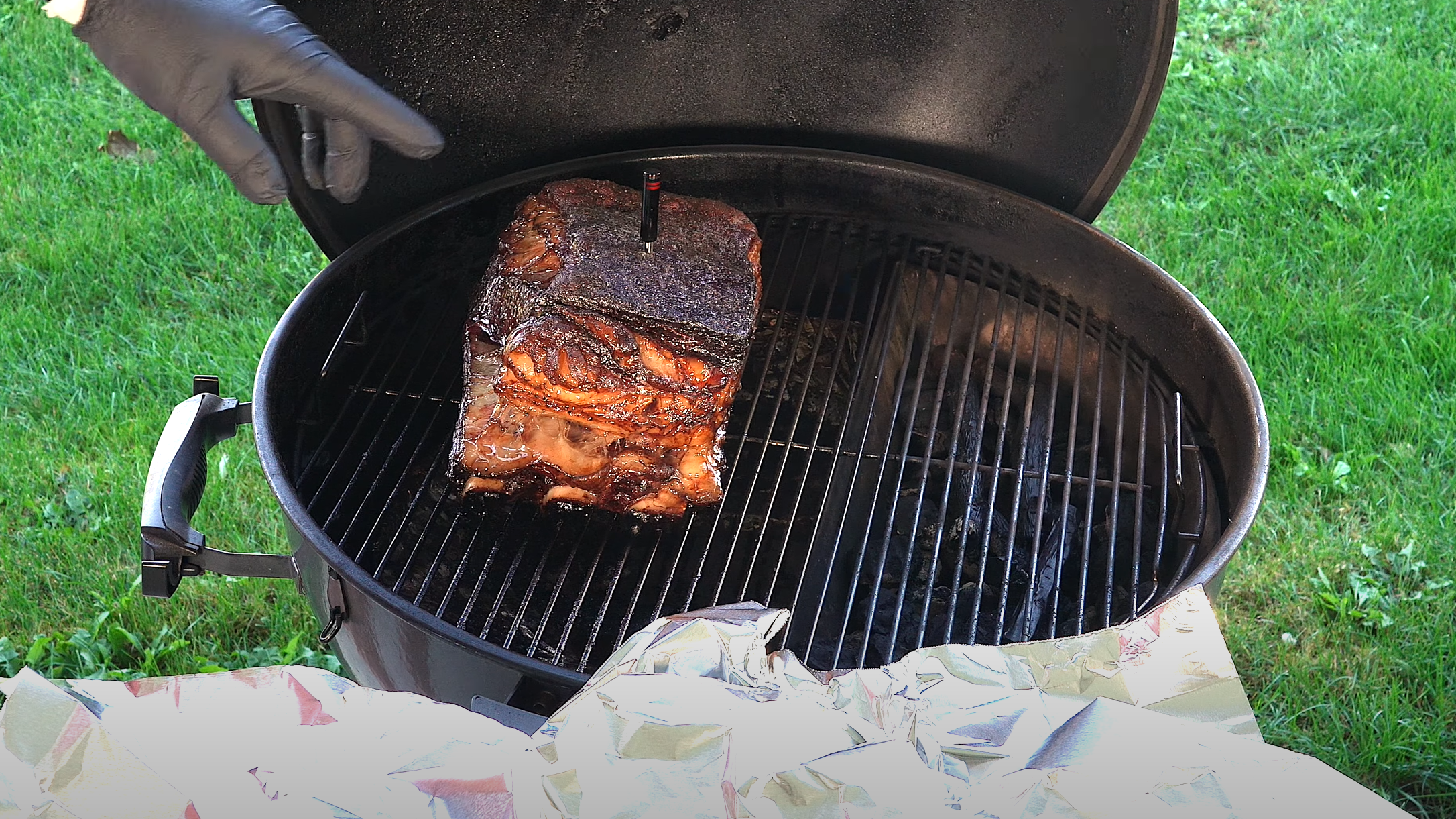 All right so we hit our magic number. Right around the 160s. It's looking pretty nice boy did it really puff up. You'll notice I did move the MeatStick because I was worried when I first went in I was in a layer of fat, and that of course, heated up faster, so got everything set up now.