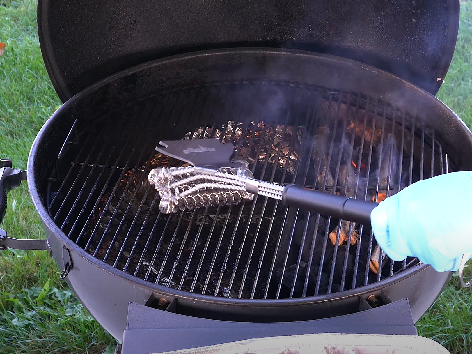 All right, let's get this on. Give the grates a quick rub. [Using Grillaholics Bristle Free Grill Brush]