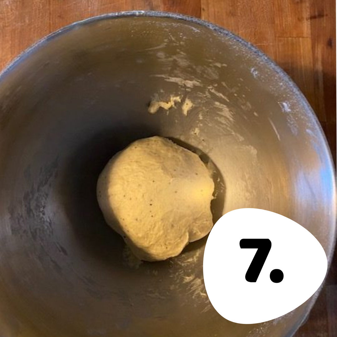 3. Using your stand mixer, mix together on medium speed and knead until a sticky dough forms (this will be a softer, higher-hydration dough, so it won't come together in a firm ball and will end up sticking to the bottom of your mixer bowl).