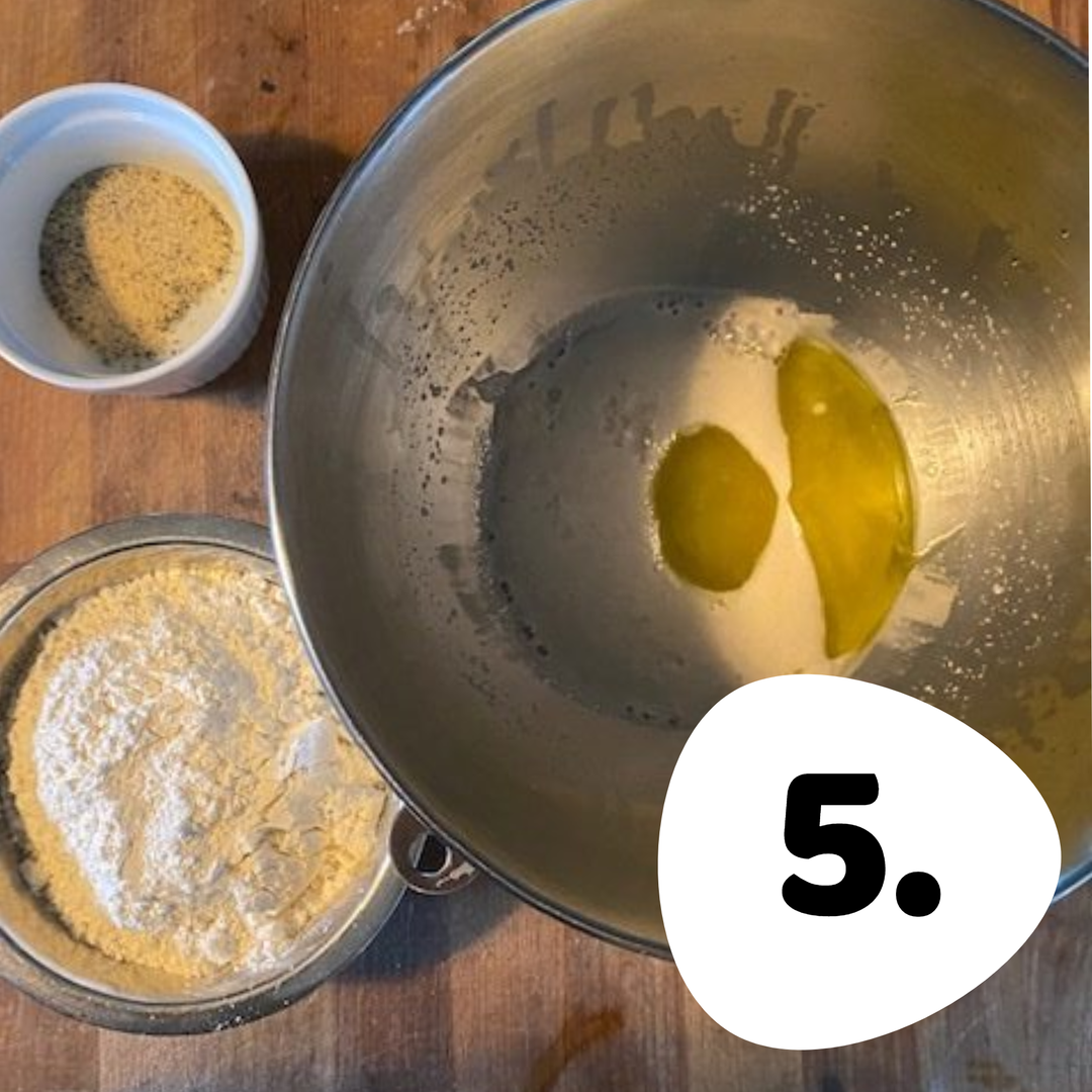 2. Add the olive oil, 2T. Of SPG + Butter, and 2 cups of flour.