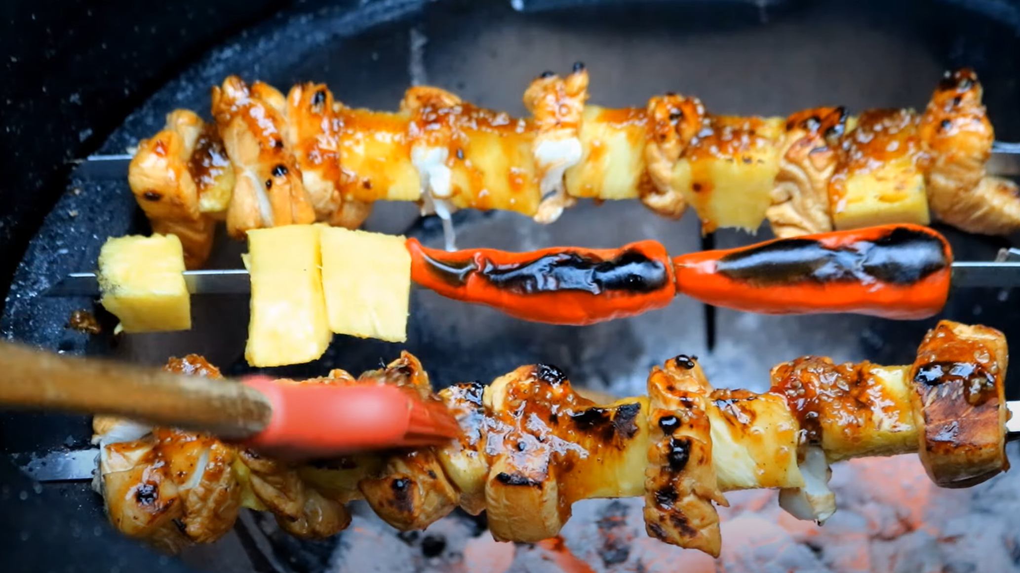 You can see I've got a nice bed of coals here. We're just going to cook these open flames, and I got a little extra pineapple there. A couple of peppers. We'll put those on as well, but this grill is pretty hot. It's only going to take a couple… three minutes each side. Turn these guys over.