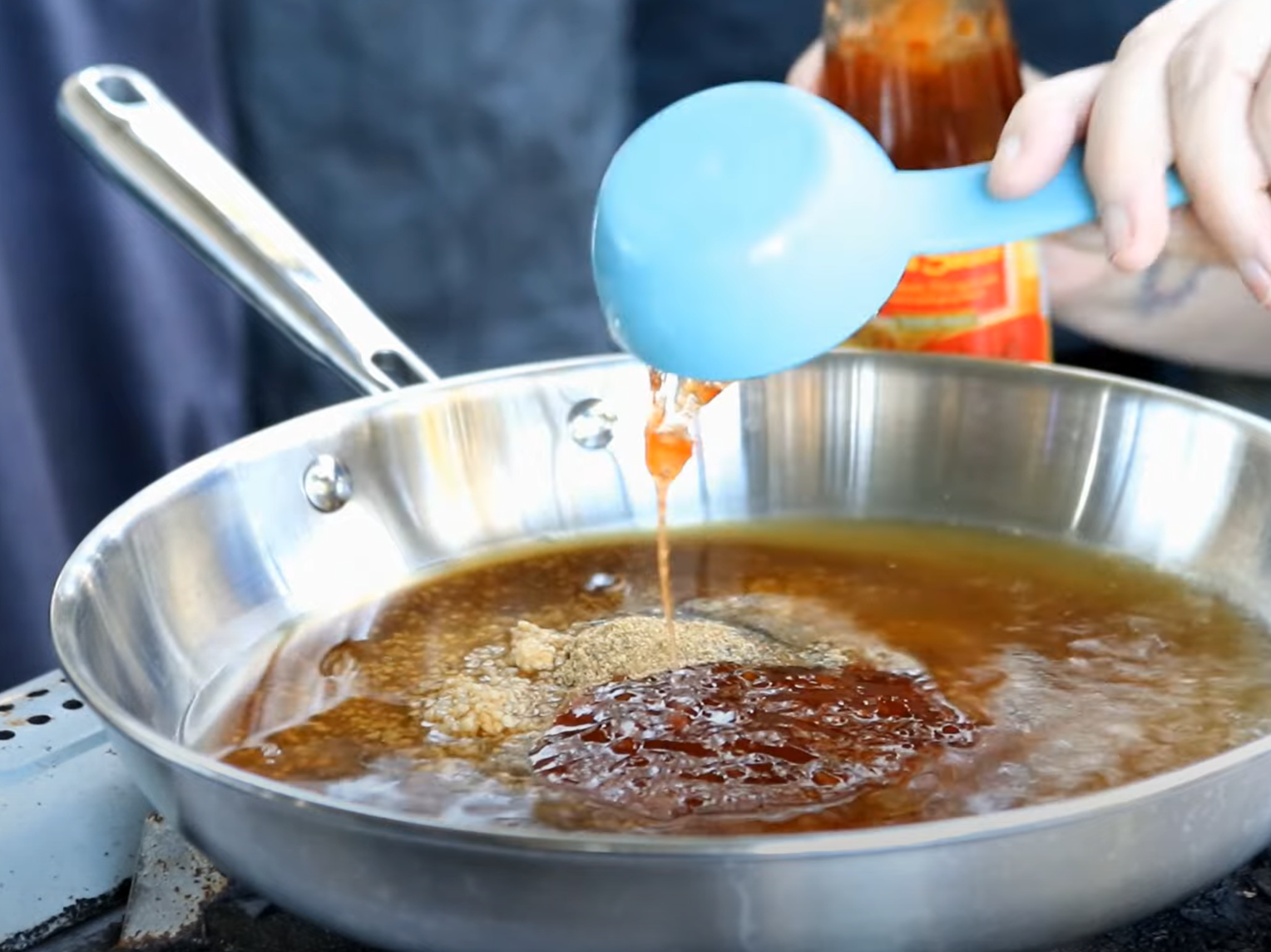 Then, we're gonna get this stuff up to a boil, and we're gonna let it simmer down so we can use it as a glaze over the top. All right, so you can see it's coming up to a boil. We're going to let this reduce to about half.