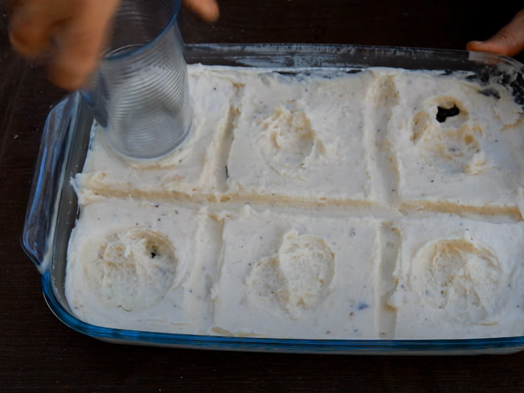 Now, we're going to bring our mashed potatoes back over, and I've just got a glass here. I'm going to put a little impression in each of these potato... What would you call them? Squares?
