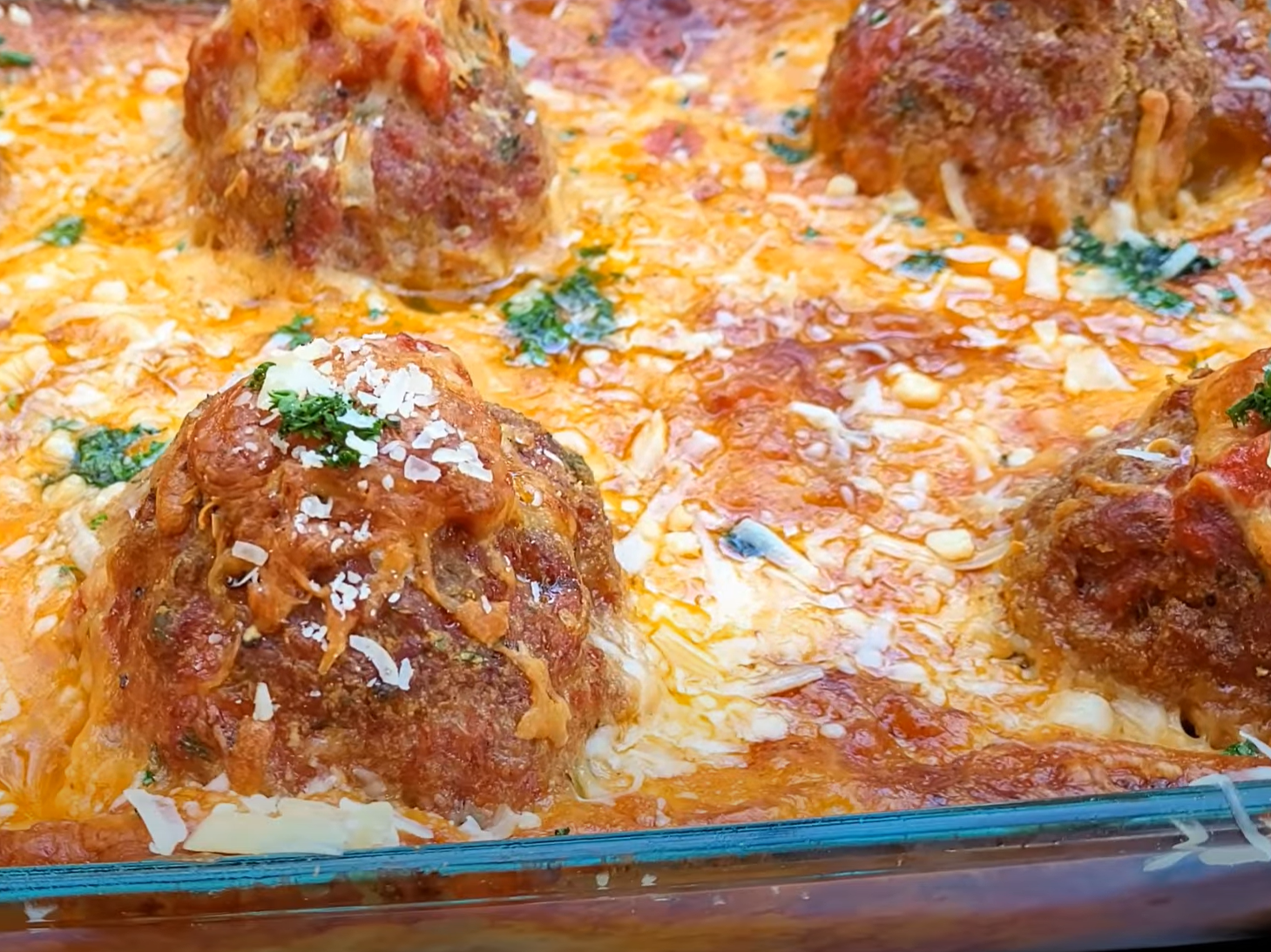 Hey, it's been 30 minutes. Look at that goodness. We’re just going to take a little bit of that tomato sauce, not a lot. I said tomato sauce… spaghetti sauce. Just a little on each meatball.