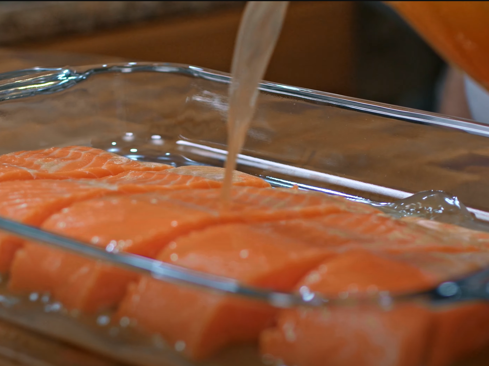 So let's go ahead and put these fillets into a glass dish. That's gonna be our brining dish. Okay, now we're just gonna take this brine that we made, and we're gonna pour it over the salmon.