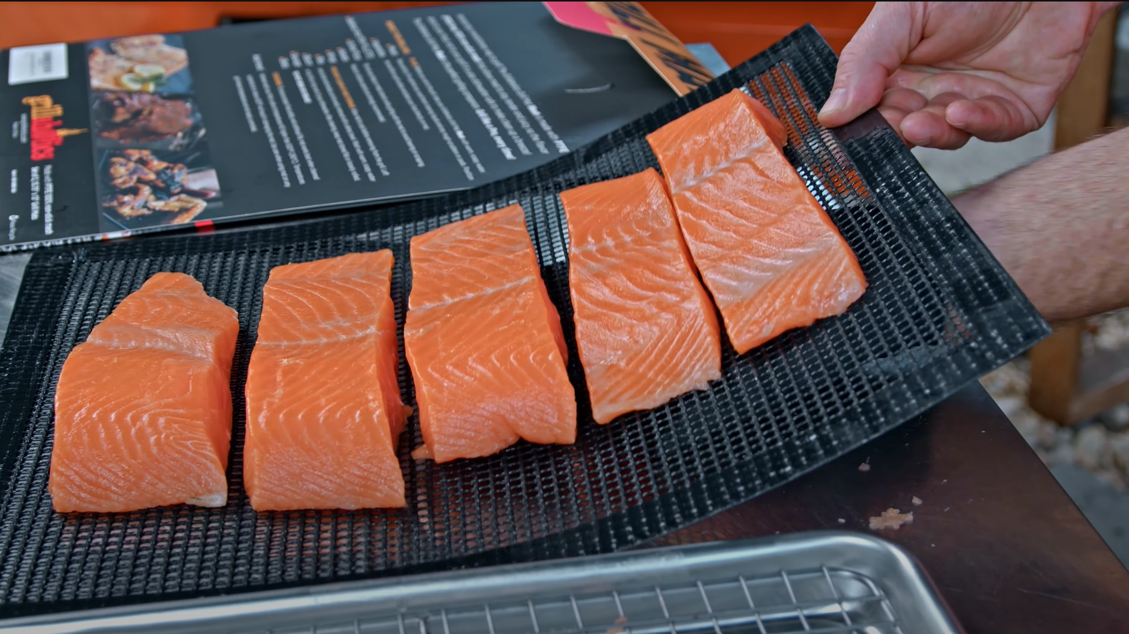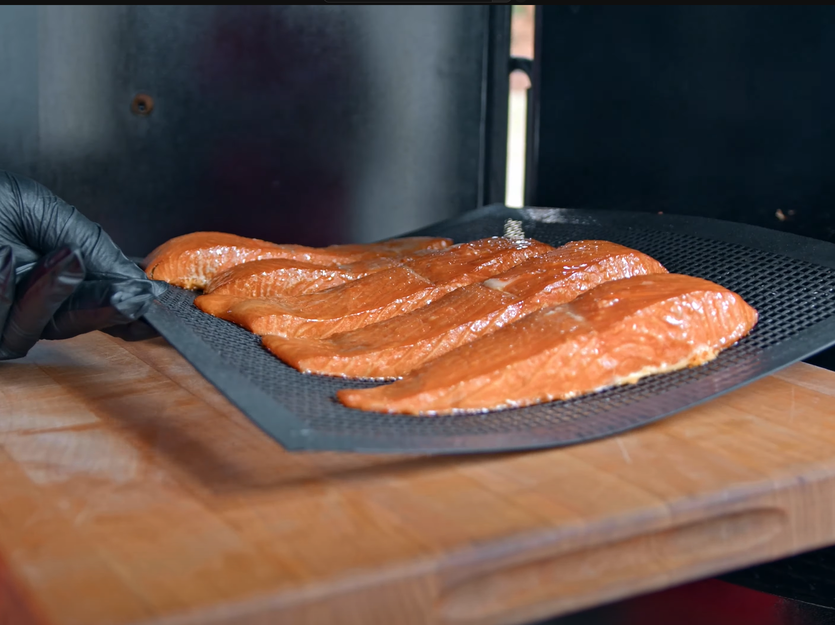 Now, I'll move the salmon over onto this mesh grill mat from Grillaholics. I didn't like grill mats before I found this one because the smoke can't get through them, but this one's a nonstick mesh so it's perfect for this. All right, let's get the salmon onto the smoker mesh mat and all for an hour or so. Until the fillets reach an internal temperature of 140 or 145 degrees Fahrenheit.
