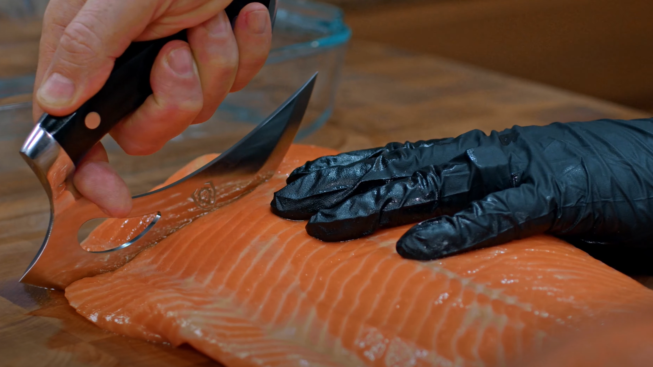 It's a great curved knife, and they use it as a utility knife. And this is Dalstrong's shogun series. Right, so I'm going to use this to cut the salmon into fillets.