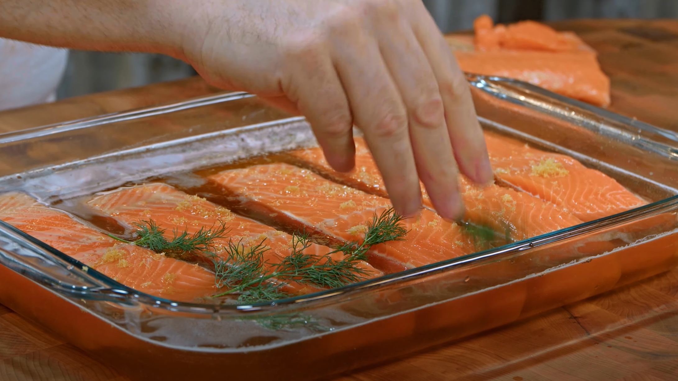 Okay, and then, finally for just a little bit more flavor, we're just gonna lay some dill into the brine here, and let some of that flavor come out and get absorbed by the salmon. So I'm gonna throw these lemons in a bag and put them in the refrigerator with the salmon. I'm gonna cover it in saran wrap leave it in the refrigerator for eight hours, and then, I'll be back and show you the next step.