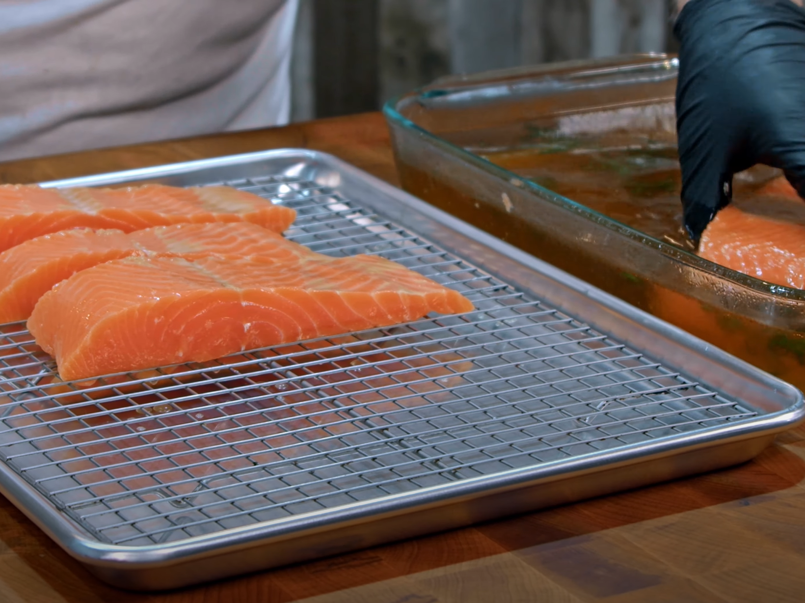 We're gonna just lay these out and the reason that we put them on a rack that sits above the tray like this is so the air can get underneath. See this is salmon that doesn't have the skin on. When you get it from Meat N’ Bone, it comes this way. And so we want to form that pellicle all the way around, so I'm putting it on the rack here so that a nice cool refrigerated air circulates…