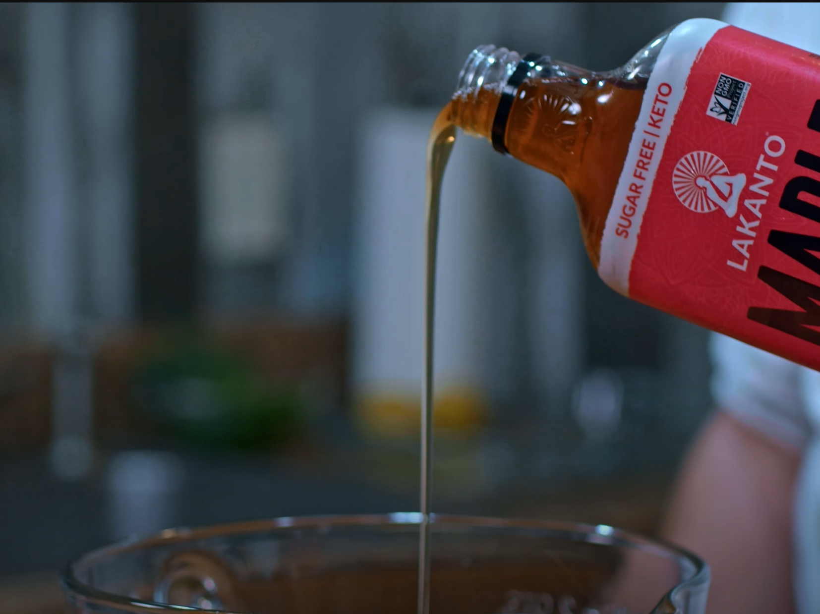 Again, I'm keto. Can't have regular maple syrup but Lakanto luckily makes this keto friendly sugar-free maple syrup. You're gonna put a cup in. This is a 13 fluid ounce bottle, so we're gonna put about two-thirds of this, and then, we just hit it with our handy-dandy whisk.