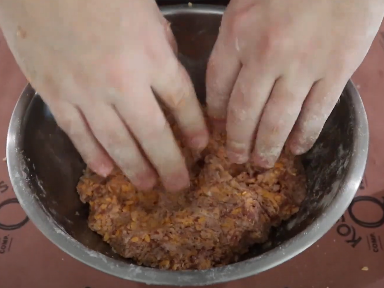 Now we get our hands dirty. We're gonna mix this together. It's gonna get gross, but it's good. Trust me. Now, this is what you want it to look like, kind of like a meat dough ball right? And for the last step, we're going to add some Honey Killer Bee...