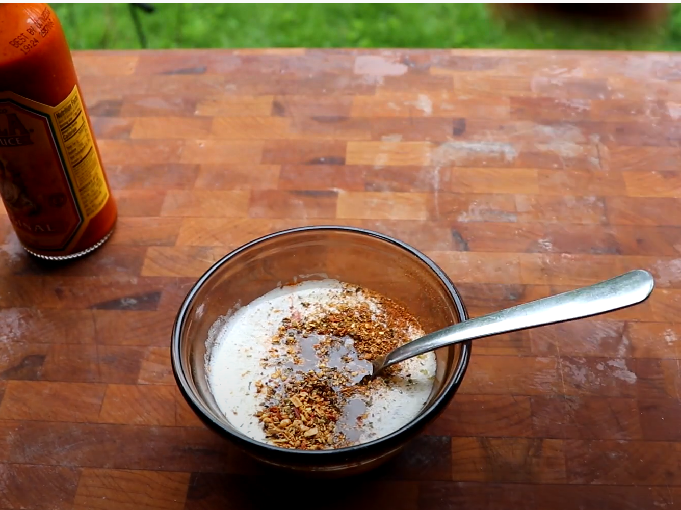 Let's go ahead and put a solid tablespoon of our delicious Grillaholics Herbacious Hen in there and give that a stir around. That'll be a good glaze for one of those chicken breasts. Don't you guys think? Come on folks! That's gonna be delicious!... Then, on one of the others, we're gonna use this jerk blend Spice Isle. I saw it at the store today. I love jerk so we're gonna give that a try.
