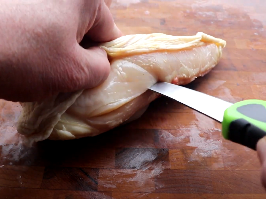 Alright folks... so we got a sweat breast here. Looking good. Skin on, bone in, split breasts, and we just want to pull our skin up here a little bit. Get in there with our knife and make a nice deep slit all the way across... so we open it up. Like that... we can put our Stove Top stuffing.