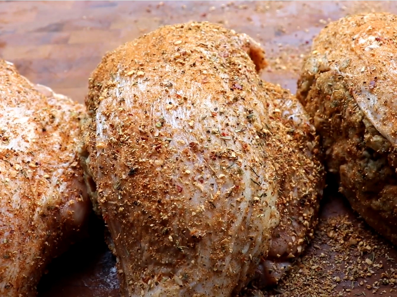 Looking good! We'll take our Grillaholics Herbacious Hen and we're just gonna coat the crap out of this sucker with our Herbacious Hen all the way around, on the side with the stuffing, the bottom, you name it! Don't forget to coat it and coat it well. When you are done. It should look something like this... Don't be shy. Never be shy with seasoning.