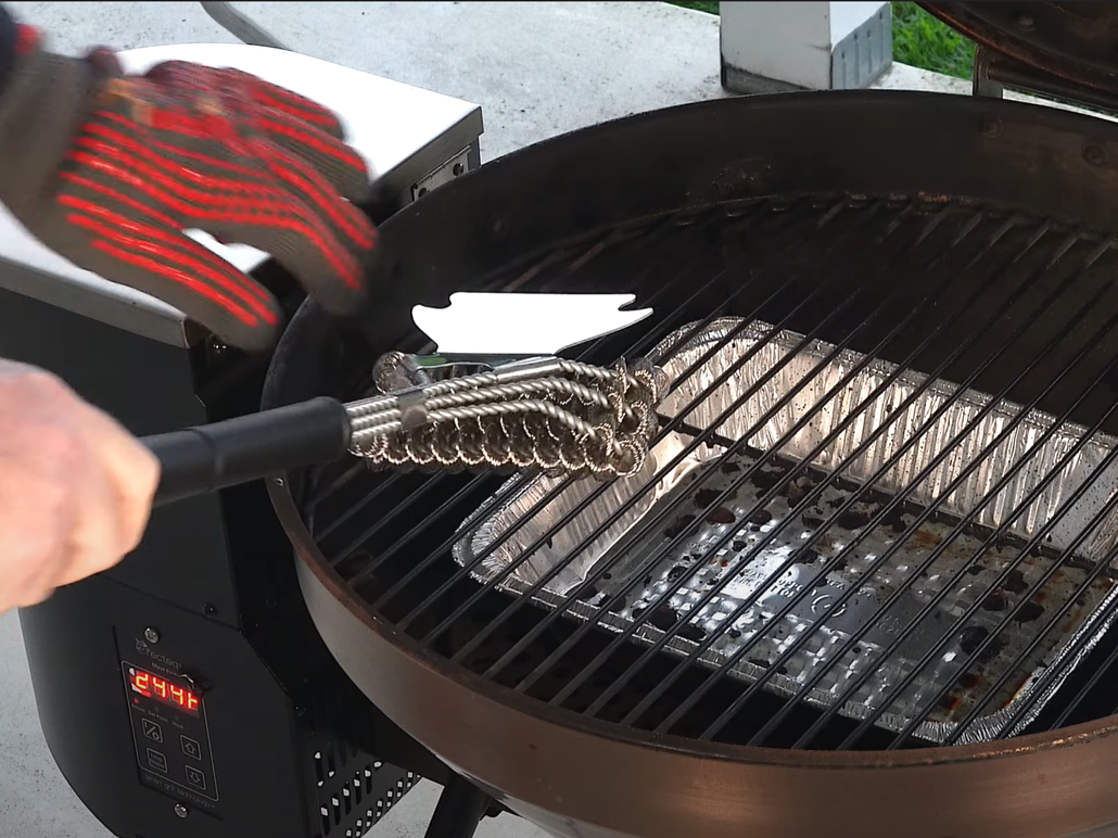Getting on the Rec Tec to warm up… Alright going to give the grates a quick clean. Got the Grillaholics, the one without the bristles today.