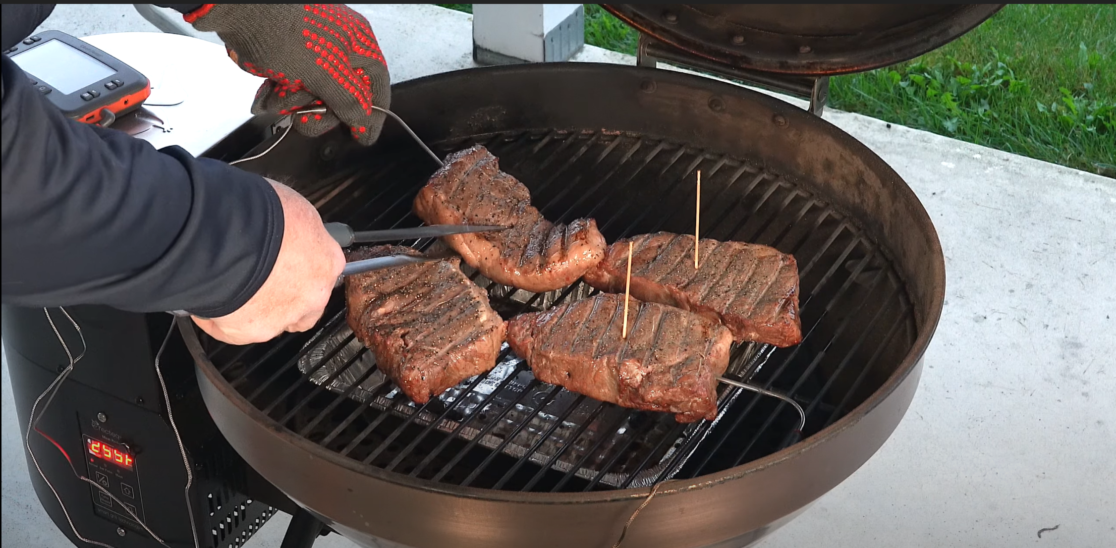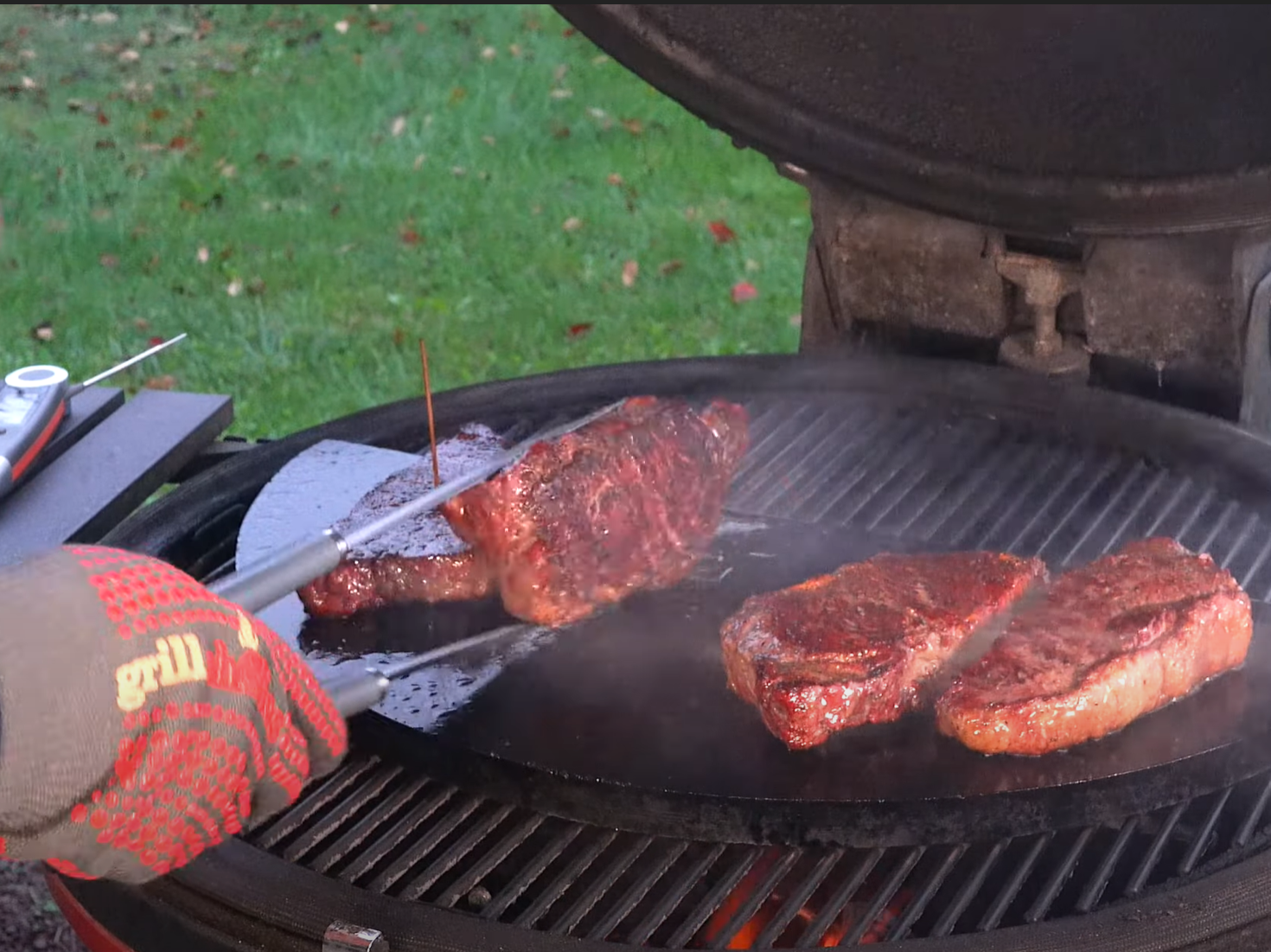 I have the multiple grills… Use one grill to warm up, one grill to sear them... So that's what we basically did tonight. Had the Rec Tec 380 set at 250. Let them warm up. We got about 75, flipped them. Got to 100. We pulled them off. I already had the Kamado Joe running at around 520 degrees so it means the stone was probably around 550 to 560 which we’ve been finding out has been a nice temperature to sear it because I can actually leave them on a little bit longer. That's why I pull them off at 100 because we like medium rare…