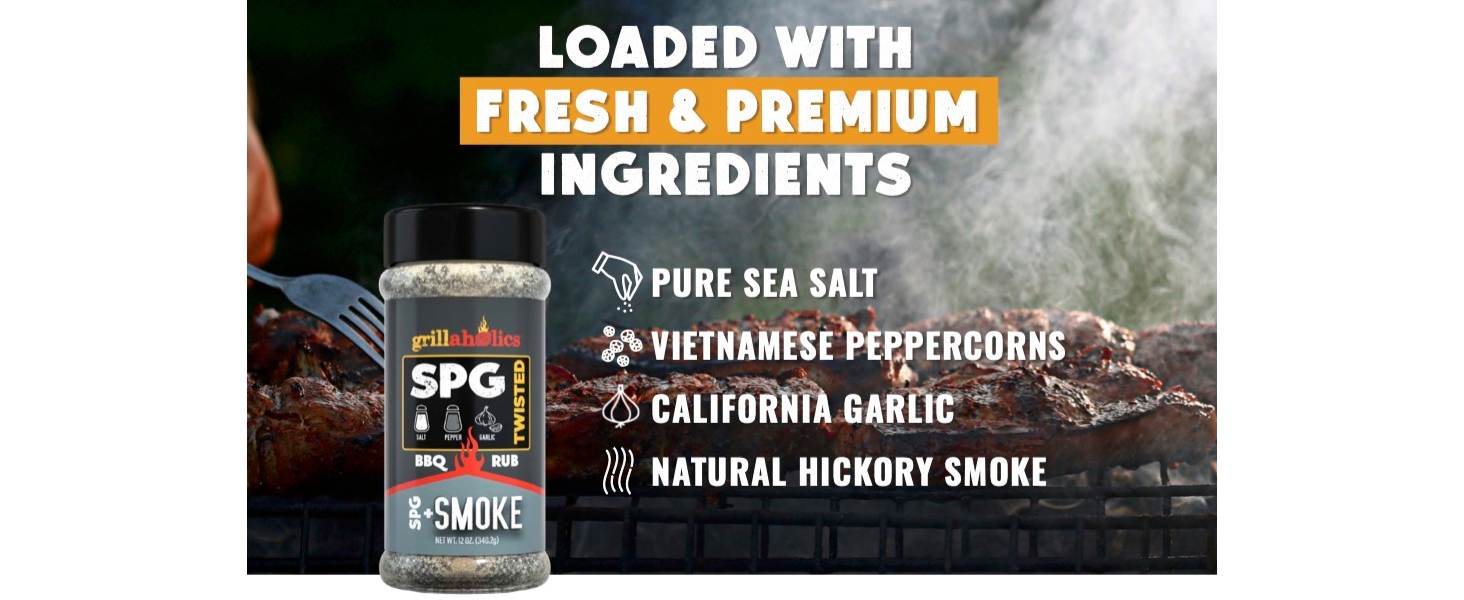 Take your grilling to the next level with Grillaholics SPG + Smoke! Whether you’re cooking on a stovetop, gas or charcoal grill, this blend gives your food the perfect hint of hickory smokiness without the need for hours of traditional smoking
