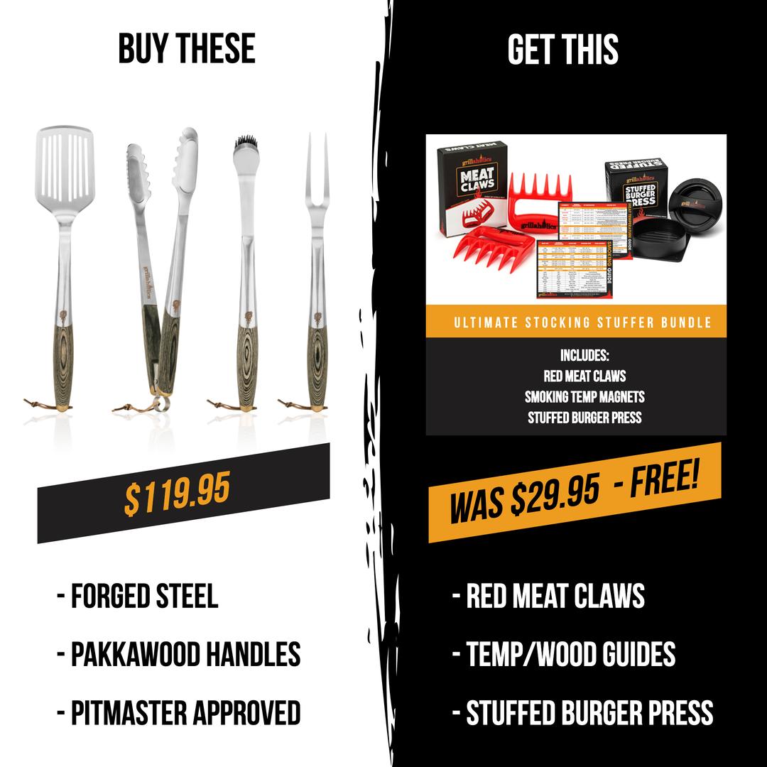 That's right! When you purchase this year's HOTTEST grill tool set you'll receive a FREE Ultimate Stocking Stuffer bundle that includes a pair of Red Meat Claws, a Stuffed Burger Press and our Meat Smoking Temperature & Wood Pairing Guide Magnets! *HURRY - Limited Quantities of This Deal Available!