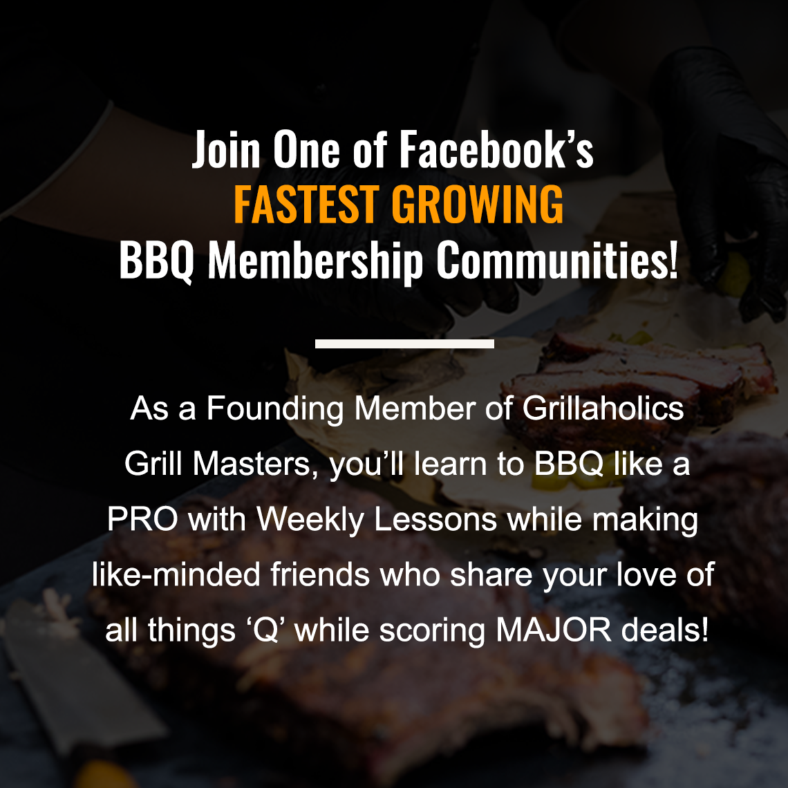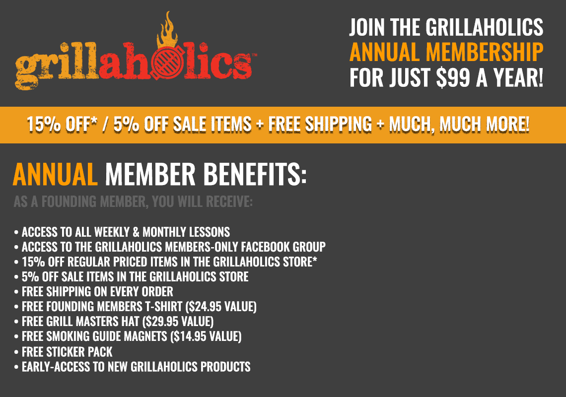 As a Founding Member, you will master a new BBQ/Grilling skill each month through weekly video lessons, helpful tips/tricks, and feedback from other grillers just like you, as well as the chance to win the monthly prize giveaway (valued at $200!!) and have your project featured on the Grillaholics Members-Only Group!